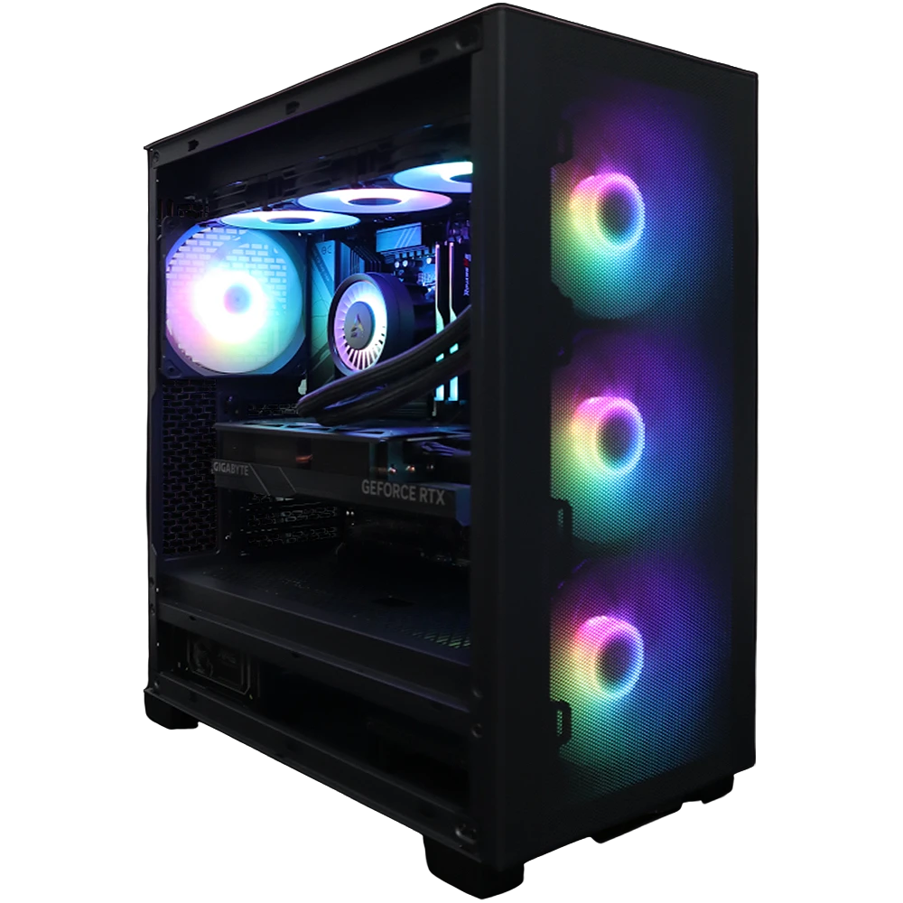 Meet the Aurora Fox – built inside Mid-Tower chassis featuring high airflow performance mesh front and tempered glass side panel. Case cooling is handled by 4x140mm fans while the processor is cooled by a 360mm liquid cooling system keeping temperatures in check even under highest stress levels. Front panel includes a combo headphone/microphone jack, a Type-A USB 3.0 and a Type-C USB 3.0 ports.