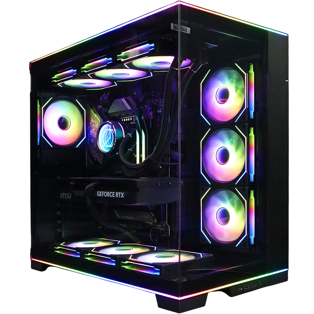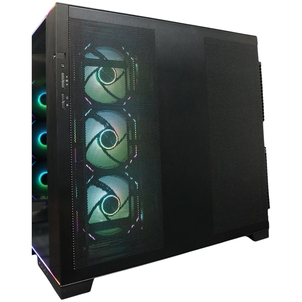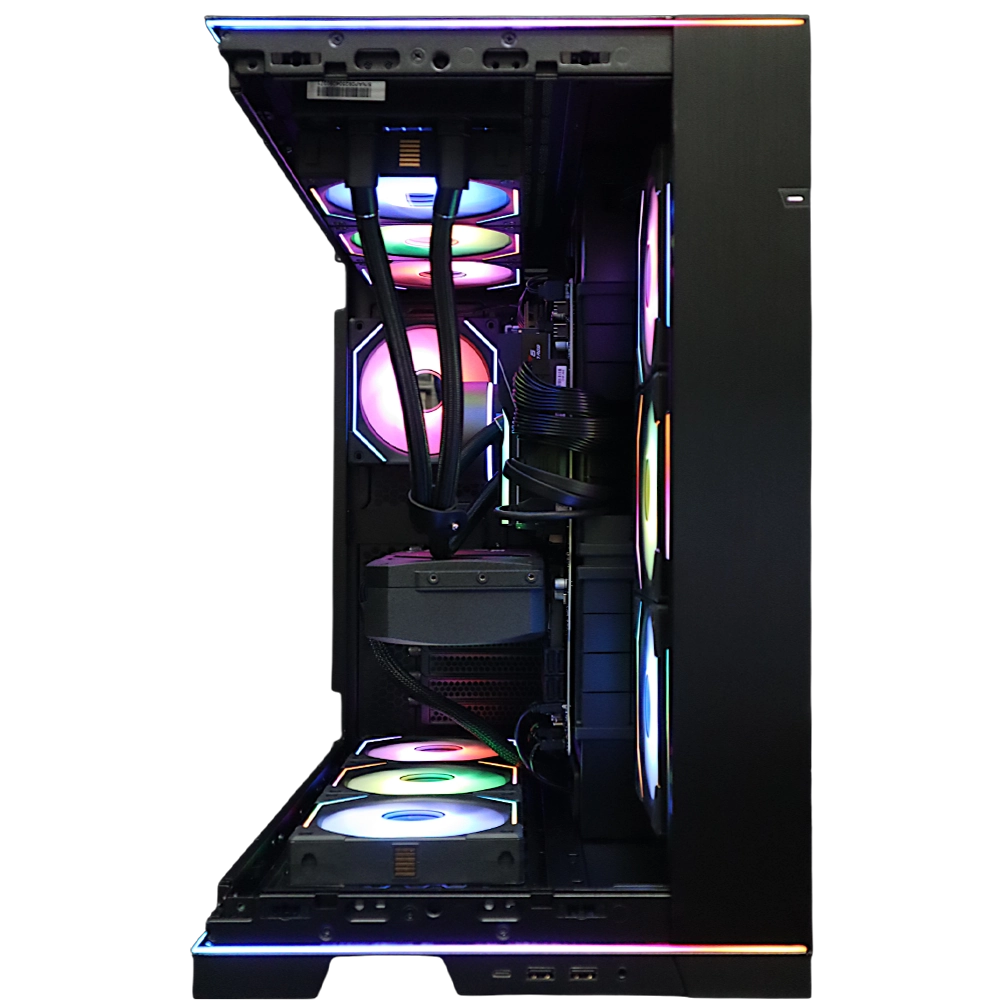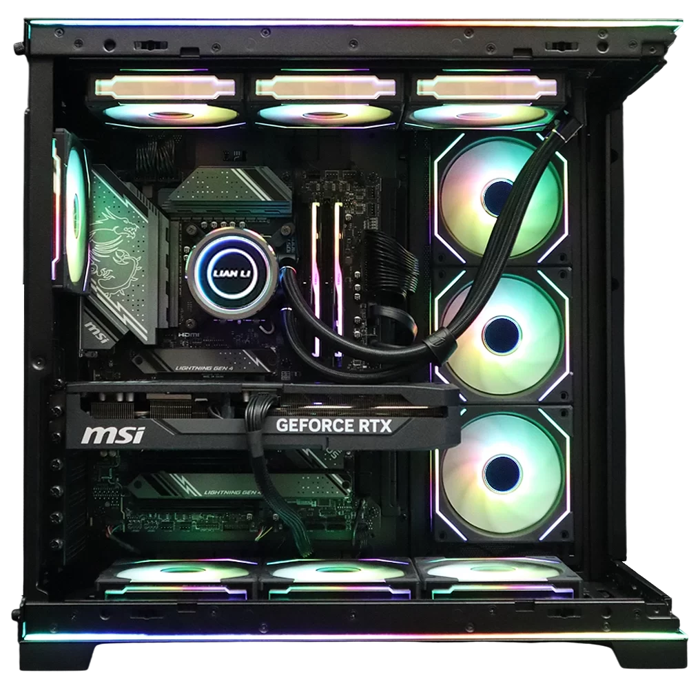 Built inside the Lian Li 011 Dynamic EVO RGB case this PC can be configured to be anywhere from competitive 1080p performer to a 4K visual powerhouse. 10 Lian-Li Infinity Series fans provide excellent cooling to the GPU and all internal components. The dual ARGB light strips running through the top and bottom of the chassis along with ARGB fans will look stunning on your desk. For an even cleaner look – The side and bottom fans are reverse blade – providing cold air intake without compromising on looks.