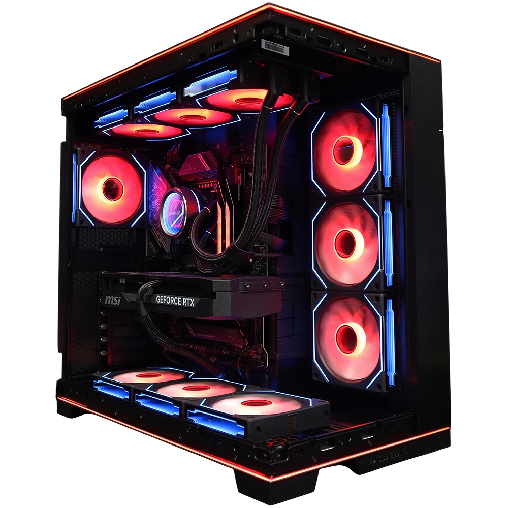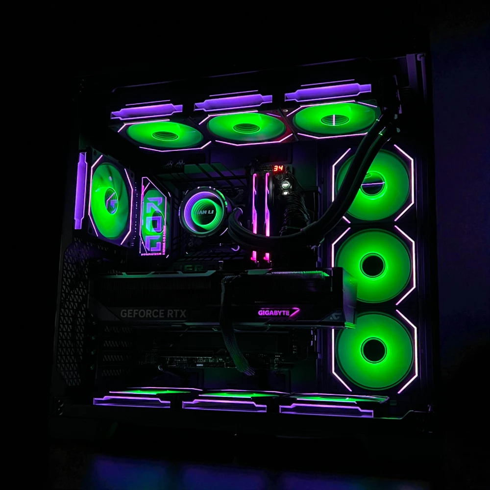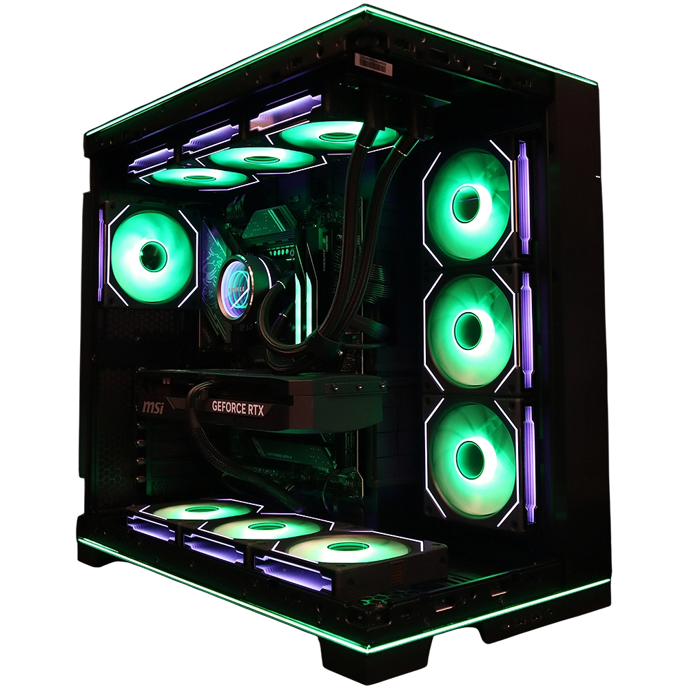 Built inside the Lian Li 011 Dynamic EVO RGB case this PC can be configured to be anywhere from competitive 1080p performer to a 4K visual powerhouse. 10 Lian-Li Infinity Series fans provide excellent cooling to the GPU and all internal components. The dual ARGB light strips running through the top and bottom of the chassis along with ARGB fans will look stunning on your desk. For an even cleaner look – The side and bottom fans are reverse blade – providing cold air intake without compromising on looks.
